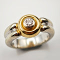 This stunning 18kt white and yellow gold diamond ring showcases a round brilliant cut diamond weighing approximately 0.15cts, with G colour and VVS clarity, ensuring a brilliant sparkle. The ring is crafted with a total weight of 11.81g and is designed in a size 16. Its elegant blend of white and yellow gold creates a sophisticated and timeless look, making it the perfect addition to any fine jewelry collection. Ideal for those who appreciate luxury and refined style.