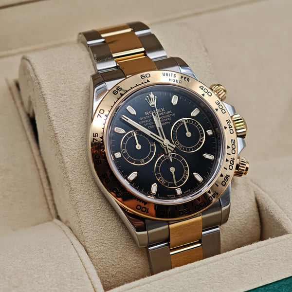 A statement piece that’s both powerful and elegant, the steel & gold Daytona is a staple in any serious collection and a timeless symbol of speed and sophistication.