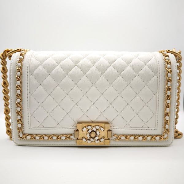 Introducing the Chanel Small Chain Around Boy Bag—a harmonious blend of edgy design and timeless elegance. Crafted from luxurious black leather, this bag features the iconic diamond quilting and a distinctive chain-link accent that outlines the front flap, adding a bold touch to its classic silhouette. The antiqued gold-tone hardware enhances its vintage charm, while the adjustable chain-link shoulder strap offers versatile carrying options. Inside, the bag is lined with grosgrain fabric and includes a single interior pocket, providing both style and practicality. Secured with a push-lock closure adorned with the signature interlocking CC logo, this piece is a testament to Chanel's commitment to exquisite craftsmanship and design.